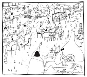 In order to claim a utopia, we need a kitchen, toilet and wifi. Levi Strauss’s contribution to anthropology was that the discovery of cooking changed humans from primitive to cultured beings. From this perspective, the kitchen is also the place where culture was born and can be reborn under sizzling sounds and appetizing smells. What has to be examined around the table is not only what and with whom we want to eat, but we also have to answer the what and with whom regarding questions of learning, building, celebrating and sharing. Even more important than the what becomes the how. Claimed utopias cannot be summaerized in one sentence nor in a handful of pictures. They are debated and experienced, never fit into 15-minutes talks and confuse the audience. They are deeply intertwined with a place and a community and thus require a high desire of presence and residence (which makes the wifi necessary for the pursuit of our ordinary lives). In a way they function like our own artist residencies or research base. They are the sum of many personal quests and can produce or be founded upon infrastructures such as libraries, active citizen associations, bread ovens, unused cultural establishments, the desire to found a community or city or a public garden.
